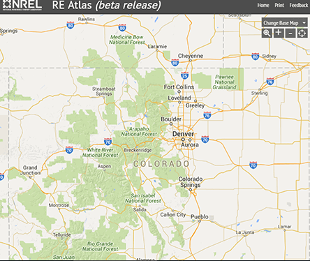 Zoom and pan tools. - Check the boxes under the Resources folder (located on the left under the Data Layers tab) to switch between the maps depicting the potential for the five different forms of renewable hydropower, biomass, geothermal, wind and solar. Use the icons in the lower left corner to read more information about each form of energy.