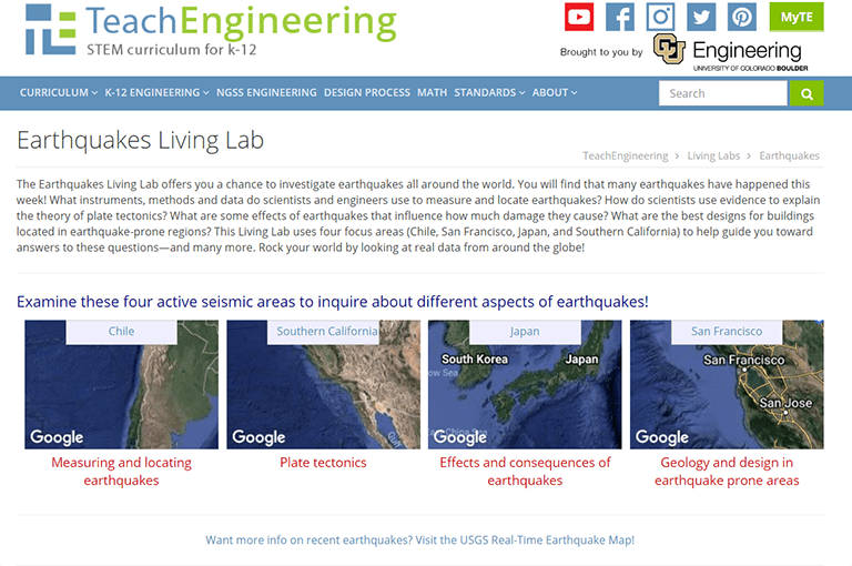 - Get the teams started by guiding them to the Earthquakes Living Lab via the living lab website at http://www.teachengineering.org/livinglabs/index.php. Have them scroll down to the Earthquakes Living Lab section (see Figure 1). Tell students that this activity is designed around the Earthquakes Living Lab, a resource and online interface that uses real-time, real-world seismic data gathered from around the world.