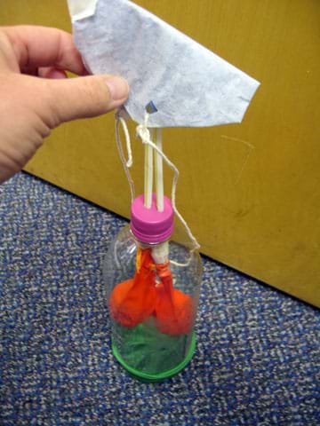 - Divide the class into groups of two students each. Provide each team with the materials, cut-off bottle, screw lid with holes, straws (or tubing), balloons, rubber bands and clay.