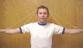 - Have each group make a simple cable-stayed bridge. Have students stand up and hold their arms out horizontally to each side. Have them imagine their arms form a bridge and their head is a tower in the middle. In this position, their muscles are holding up their arms. Now, using the rope, have the students become cable-stayed bridges (see Figure 5). Tie each end of the 5-foot (1.5-m) piece of rope around each elbow. Position the middles of the ropes on the tops of their heads. The rope acts as a cable-stay and holds up the elbows. Using the 6-foot (1.8-m) piece, repeat this process tying the ends around their wrists.
