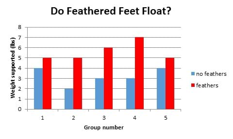 - As a class, graph the results (see example in Figure 4). Expect each group to generate two data points: a weight supported for feathered and non-feathered feet.