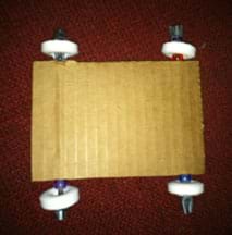Figure 1. To make the car base, use a wooden skewer to widen two cardboard channels a bit so the stirrers/axles slide in easier.