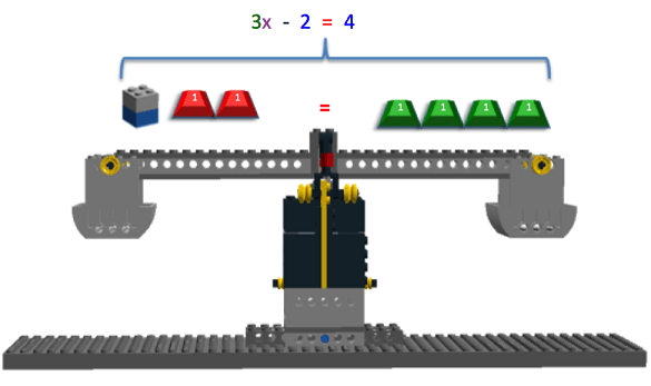 - Allow students to configure the given equation on the LEGO Balance Scale using a LEGO brick for the unknown variable, LEGO plates for the unknown variable's coefficient, and green or red gram masses for positive or negative constants, respectively.