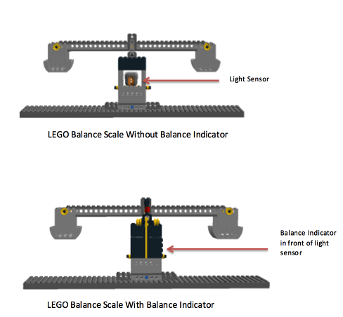 The LEGO Balance Scale is constructed before the activity begins. Figure 7 shows illustrations of the balance scale with and without a Balance Indicator. The color sensor is built into the balance scale's tower and hidden behind the Balance Indicator. The Balance Indicator's black and yellow LEGO blocks are used in order for the color sensor to detect dark (black blocks) and light (yellow blocks) variations when the scale is balanced or imbalanced when the scale sways up and down to reach equilibrium. The color sensor will see yellow when the scale is balanced and leveled horizontally, otherwise the color sensor will see black when the scale is imbalanced and unleveled horizontally.