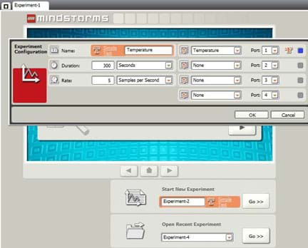 Figure 2. To use the NXT temperature sensor, use the NXT Data Logging Tool and set the "Experiment Configurations" as shown. - Open up the NXT Data Logging Tool, which is part of the LEGO MINDSTORMS NXT software provided in the base kit. In the welcome screen, create a new name for an experiment under "Start New Experiment' and hit "Go." Prepare the "Experiment Configurations" as shown in Figure 2. In this example, this sets up the experiment with a name of "Temperature," duration of 300 seconds, rate of 5 samples per second, and sensor chosen as "Temperature" on port 1. The duration of 300 seconds is for one material; feel free to experiment with other amounts of time, but be consistent throughout the activity for each material. Make sure the port number matches the port the sensor is plugged into. Press OK when the configurations have been set.