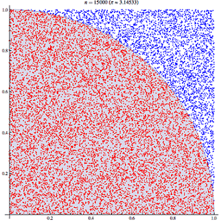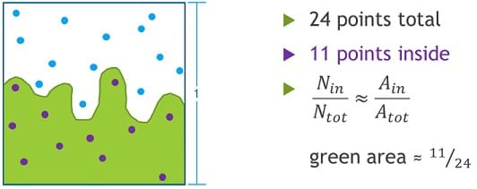 - Therefore, using a Monte Carlo sampling within this unit-area frame, the relative frequency of points inside the circle should be approximately π/4.