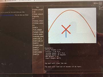 Ask the kids to modify the code using https://octave-online.net/ for serving a tennis ball on a tennis court on Earth and on the Moon. (If students are unfamiliar with tennis, explain this this sport is similar to volleyball in that the goal is to get a ball over a net to hit the ground on the other side; however, there are less players and they hit the ball with a racket). They can answer the following questions in a piece of paper, notebook, or social media used for the activity:
