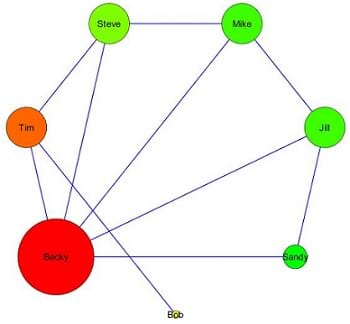 A graphic composed of seven dots (nodes) of different sizes and colors, each with a first name identifier and linked by various lines (edges). While the node for Becky is large and red; the node for Bob is small and yellow.