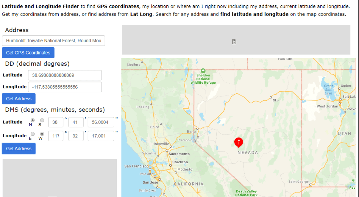 - Enter the GPS information from the metadata. Remember from basic geography in middle school that latitude and longitude can be expressed in Degrees (D) Minutes (M) and Seconds (S). At the end of the latitude there will always be a N for north or a S for south. At the end of the longitude there will always be an E for East or a W for West. Click on the get address button and it should instantly pop up and a reference point is provided on a map of where the location is. This process takes longer, but is safer.