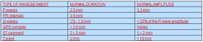 Explain to students that the amplitude of a wave is directly related to the energy of that wave. As the amplitude increases, the energy increases. Ask the students: "Of the three main waves (P, QRS, and T), which is the largest in amplitude?" [Answer: QRS.] This is the point at which blood is being pumped to the entire body, so more energy is needed to accomplish this. Show students the following diagram on a normal EKG and the following quantitative information on the amplitude of EKG waves. As students go through the four handouts in this activity, they can compare the irregular EKGs with these values to answer the questions more quantitatively.