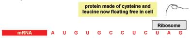 Step 3: Ribosome reads codon CUC, which means make the amino acid leucine.
