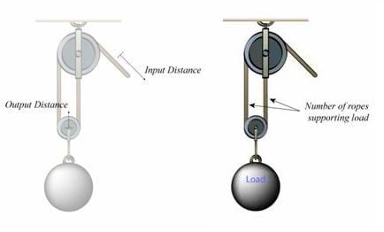Two drawings of a pulley system pointing out the input distance, output distance and number of ropes supporting load.