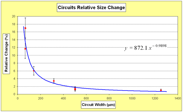 relative change = 872.1 (circuit width)-0.9898, where 872.1 = e6.7709